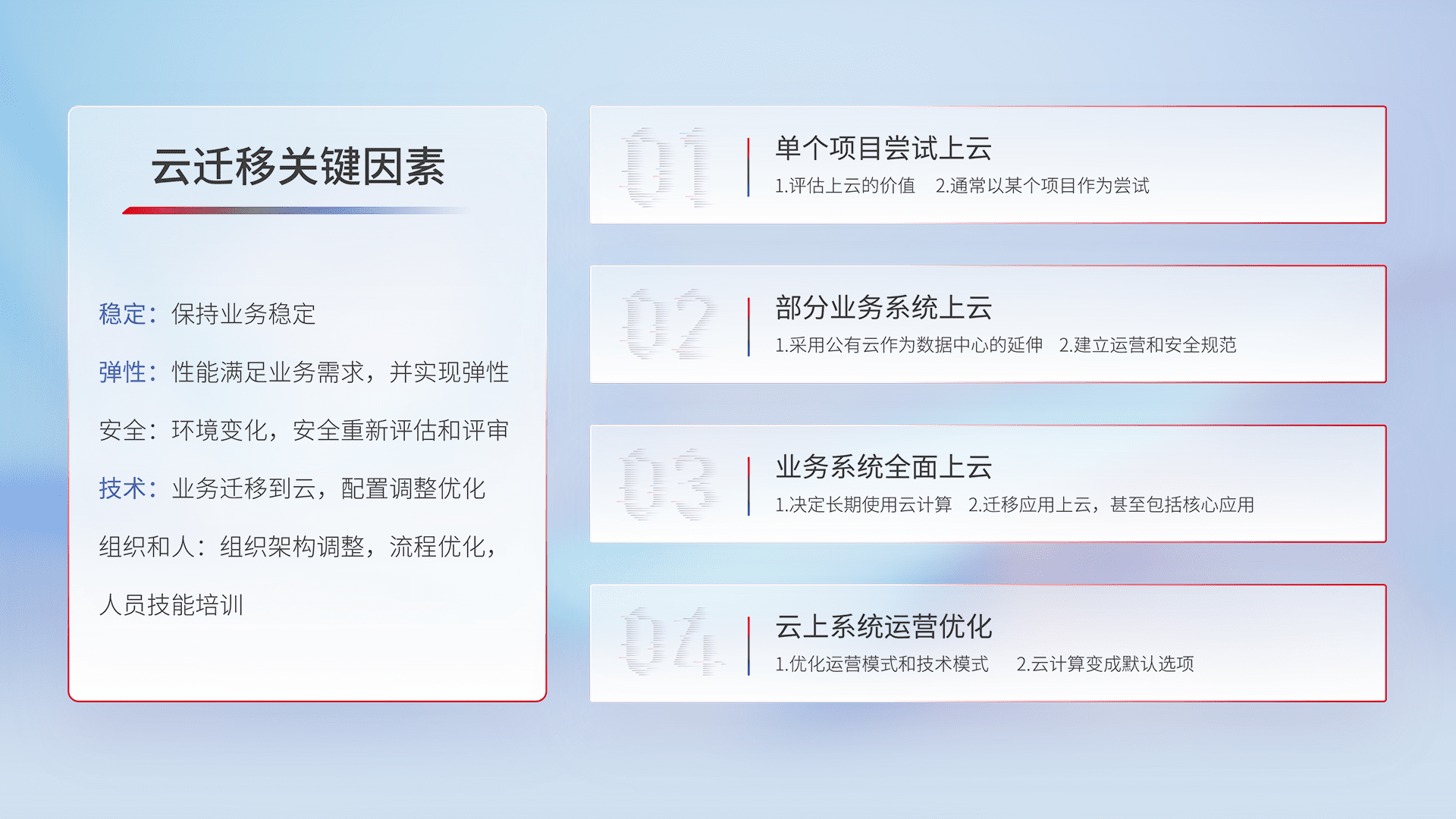 结合实际业务,,,,从规划设计、、、、云平台选型、、云原生改造、、数据迁移、、集成交付,,,,迁移全过程为客户识别最佳上云路径,,,做好风险识别管理,,设计网络架构、、身份权限、、、、安全审计合规、、、操作审计、、日志审计、、、、监控告警策略、、、多站点容灾设计等,,对云上基础设施进行整体规划,,,,提升IT治理水平,,,,以满足弹性、、、、高可用、、高性能的需求。。