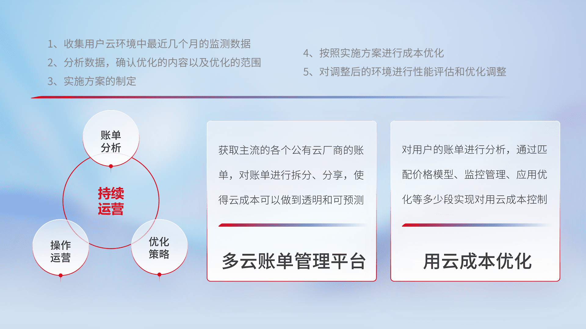 通过多云纳管,,以统一的资源数据模型把客户的云资源进行抽象和封装,,,,进而实现对多云资源的统一操作,,,,保障云资源管理的可靠性、、稳定性与可用性。。。。量身定制化运维内容,,配置、、、、开发运维、、补丁管理、、备份、、监控、、、认证和访问管理、、、审计和日常巡检等,,,,保障在用云过程中的可靠度,,,稳定度以及高可用率。。。。