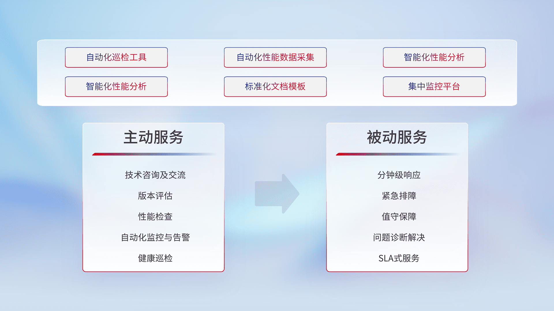 智能化工具和标准化文档,,,保障服务质量,,提供主动服务(包含技术咨询、、、、版本评估、、性能检查、、、、自动化监控与告警、、、、健康巡检)和被动服务包含(分钟级响应、、紧急排障、、、、值守保障、、问题诊断解决、、、SLA服务)。。。。